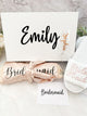 - Ribbon is personalised with name + title (example Sophia will you be my bridesmaid? or Bridesmaid etc)
